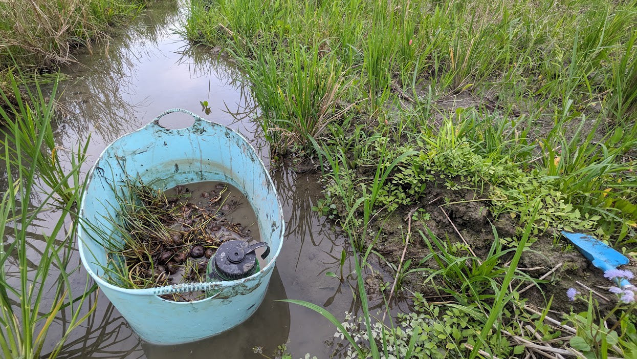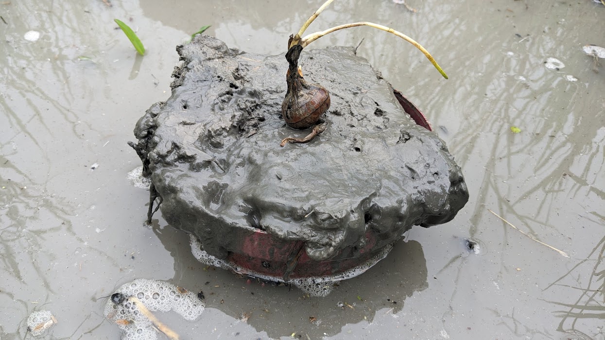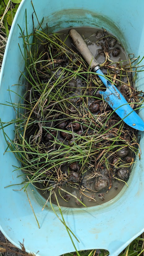 今天拖著一籃荸薺沿著水道種下荸薺,這次用了兩種種法,一是種在靠近水的土裡,另一種是種在盆子裡,然後擺在水裡。