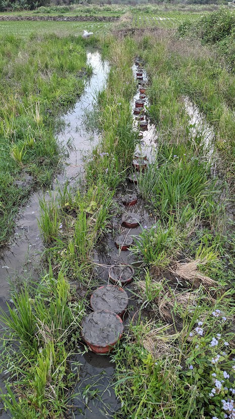當初的想法是,如果水圳的水可以穩定灌溉,只要在田區依照大概的等高線挖出不斷迂迴的溝渠,每條溝大約間隔 1~2米左右,中間的水道如果能夠經常有水,可以種水生植物,溝渠間的區域可堆高成菜畦,種些菜葉類作物,或是耐水淹的植物。但是體力和時間都不足以完成這項工作,最後只在田區兩側開了兩道縱向的排水溝渠,中間則開了四五條水平的溝渠便作罷。未來如果還有田可以做實驗,再來繼續完成。