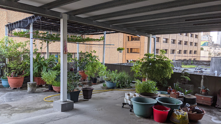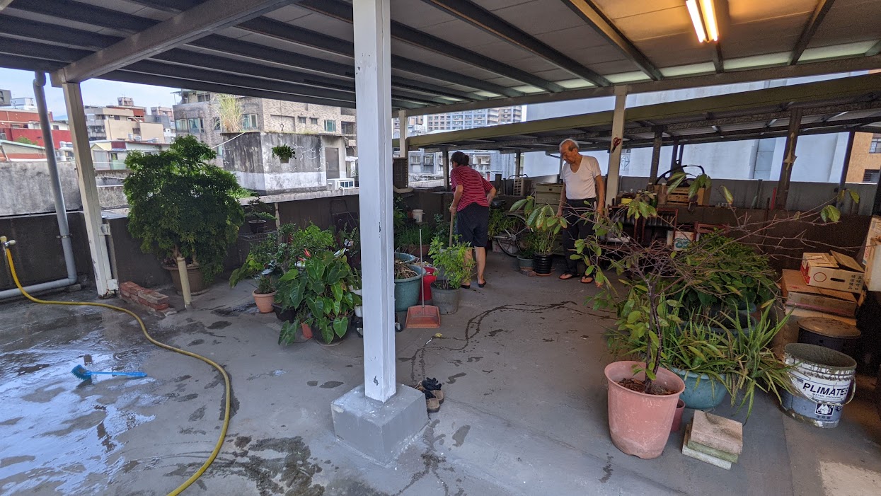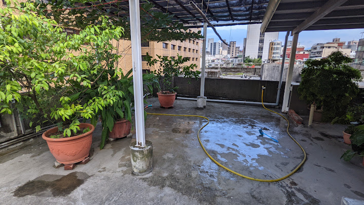 距離上一次做防水應該很多年了,所以岳父請我把屋頂再做一次防水,以前岳父是請人來施工,這一次就自己來。原本屋頂就有種一些盆栽,像是土肉桂、檸檬、薑黃、百香果等等,檸檬每年結果不少,百香果卻只長葉不開花,猜測可能是因為百香果種在遮網底下,日照不足的關係。岳父 80 幾歲,每天都會爬一段樓梯,在屋頂消磨一些時間。