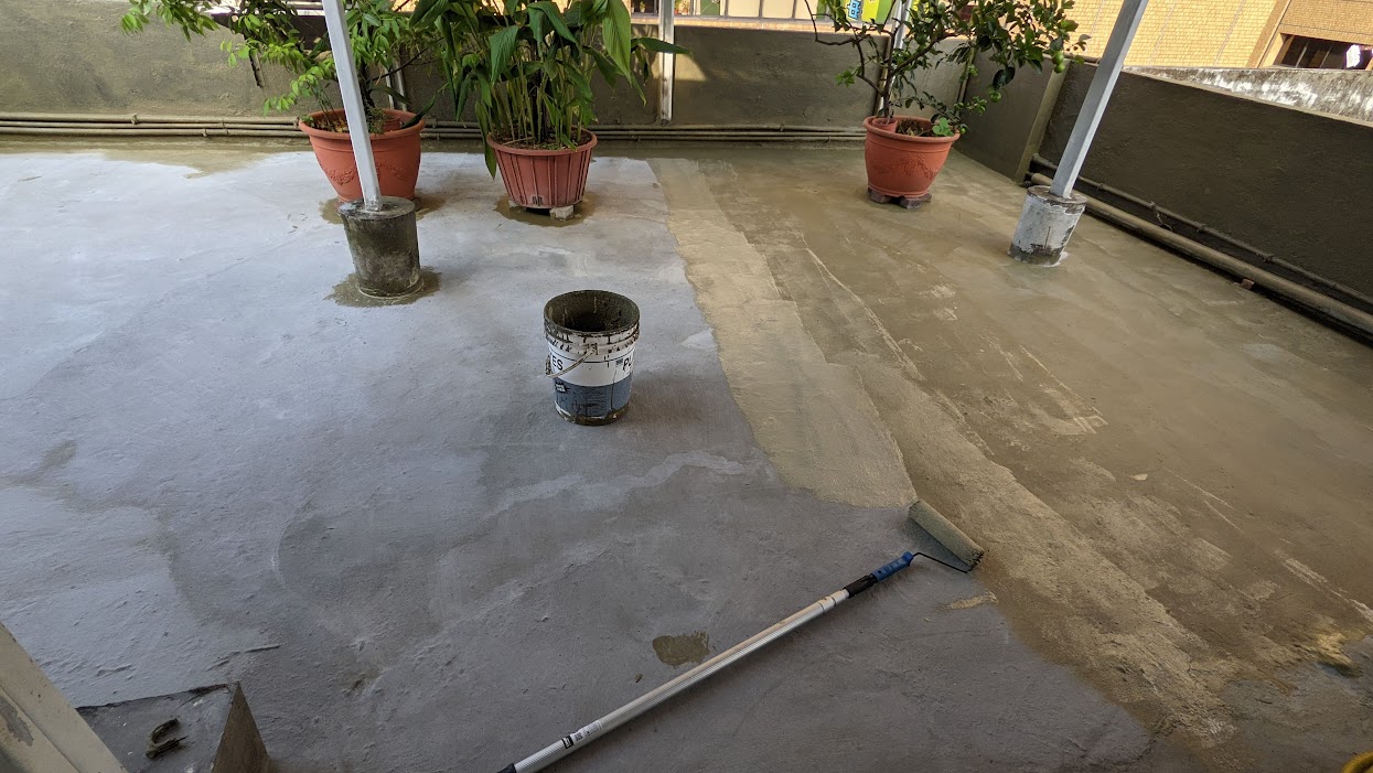 趁著雨天,把排水孔塞住,將地板刷乾淨,這樣塗上去的防水漆才能和樓板有更好的接著。如果剛好遇到下雨天,可以塞住排水孔,屋頂就是一個小水池,小孩喜歡,還可以順便清洗屋頂。