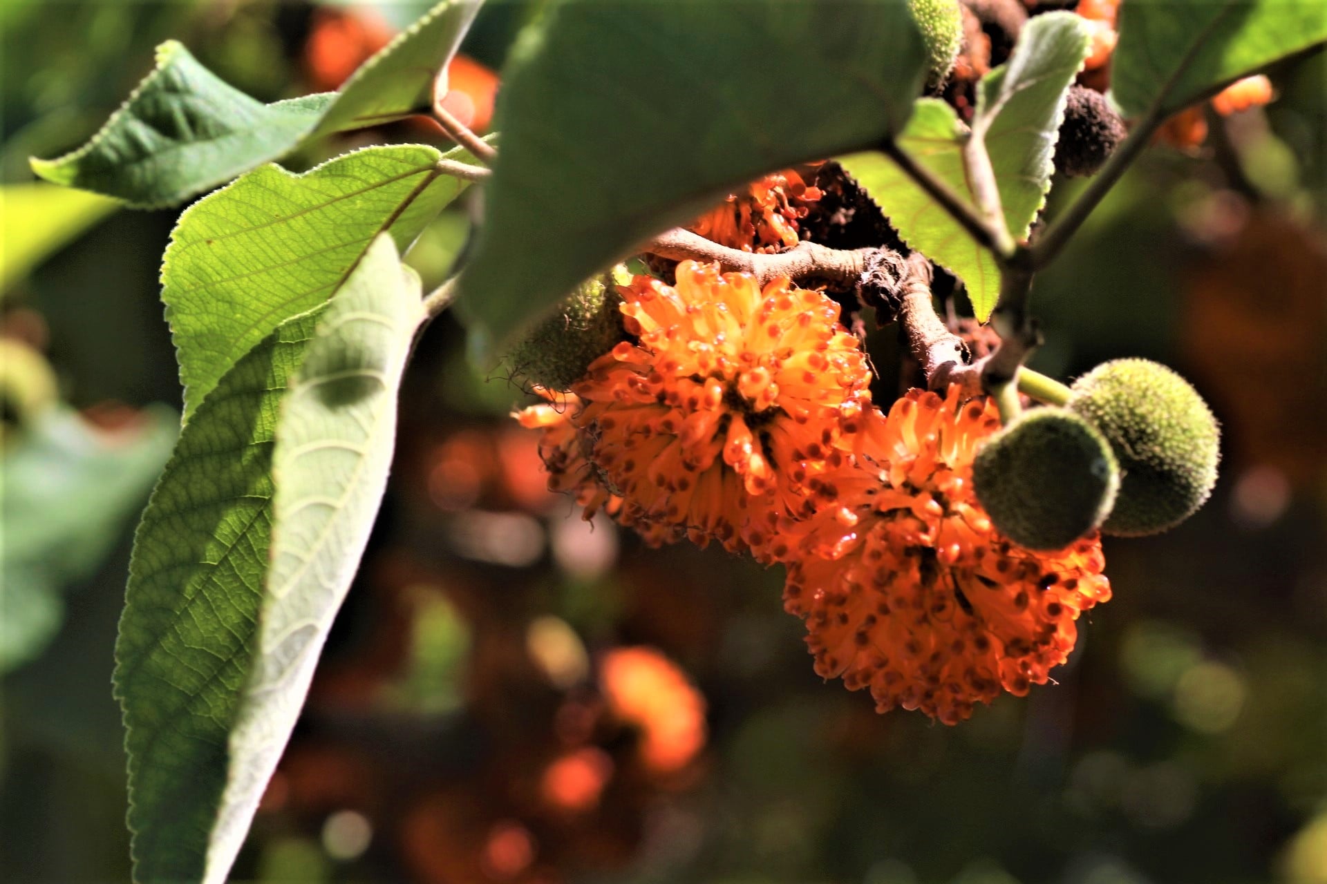 雌花受粉後,表面的白色絲狀花柱枯萎,開始發育成成橘紅色的果實雌株開花,成球形頭狀花序,有著茂密的白色絲狀花柱;而雄株的花則是長成像毛毛蟲一樣的柔荑花序。據說構樹開花時極富爆發力,為了借助風力傳播花粉,構樹會將花苞蘊釀至飽和,直到天好風大的日子,才會瞬間爆發開來。雄花彈射花粉時據說還會發出嗶播聲,有著裊裊輕煙,伴隨清晨的氣流發散開來,或許就是這股驚人的傳播花粉的能力,以致整個西部平原都是構樹的碧綠身影,相傳葡萄牙人在數百年前發現台灣時就是看到那如綠海波濤一般隨處蔓生的構樹,才會驚呼為福爾摩沙!
