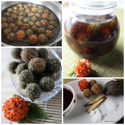 材料:構樹花軸600克、醬油5杯、鹽一匙、糖一匙、甘草兩片、昆布一片
