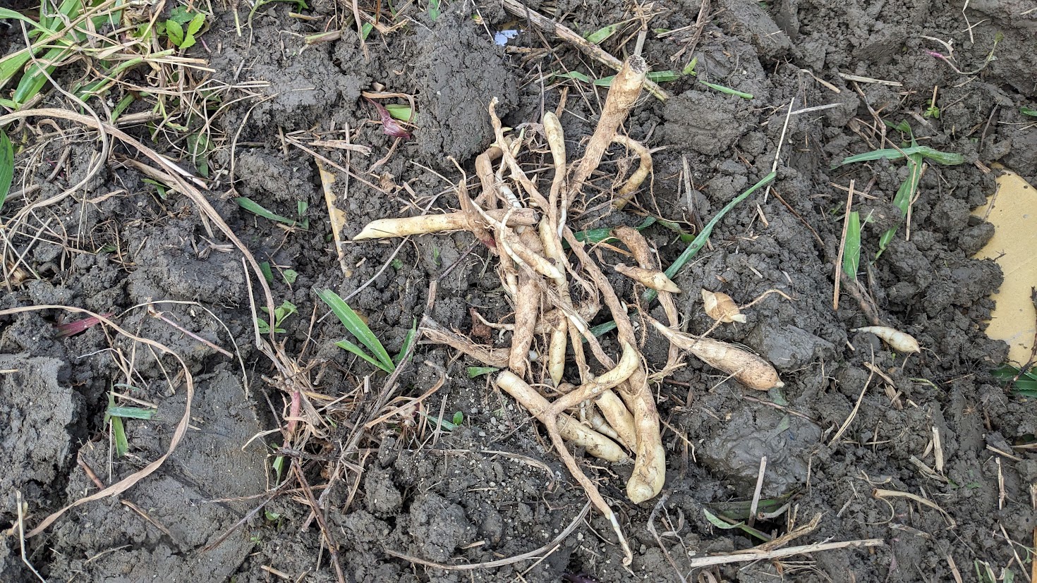 從客家農場拿到收成後剩下的葛鬱金,種回土裡繼續生長。