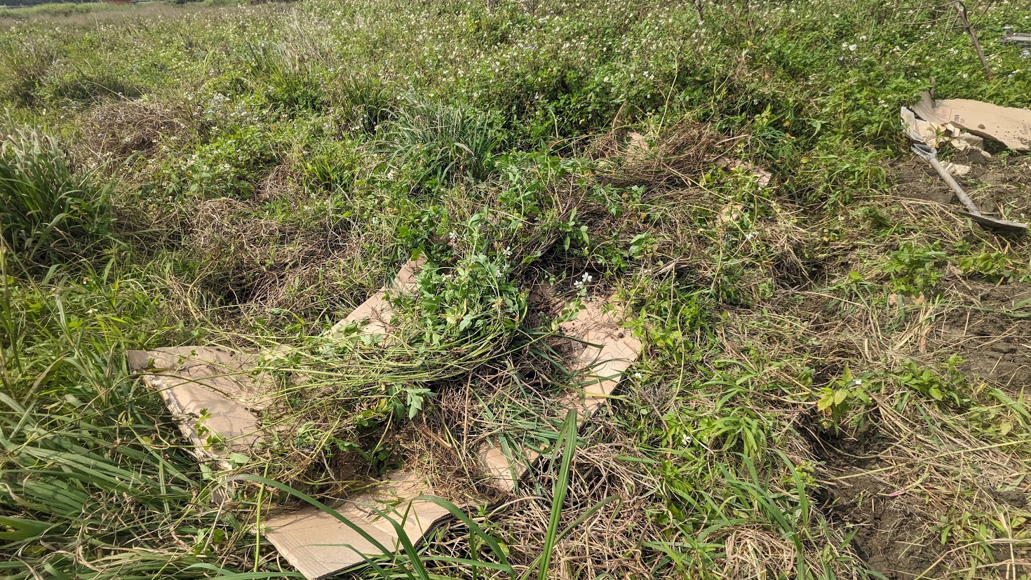 除下來的草先放置在尚未覆土的紙板上,先進行曬乾,避免根莖接觸土讓、水分後又重新發芽生長。