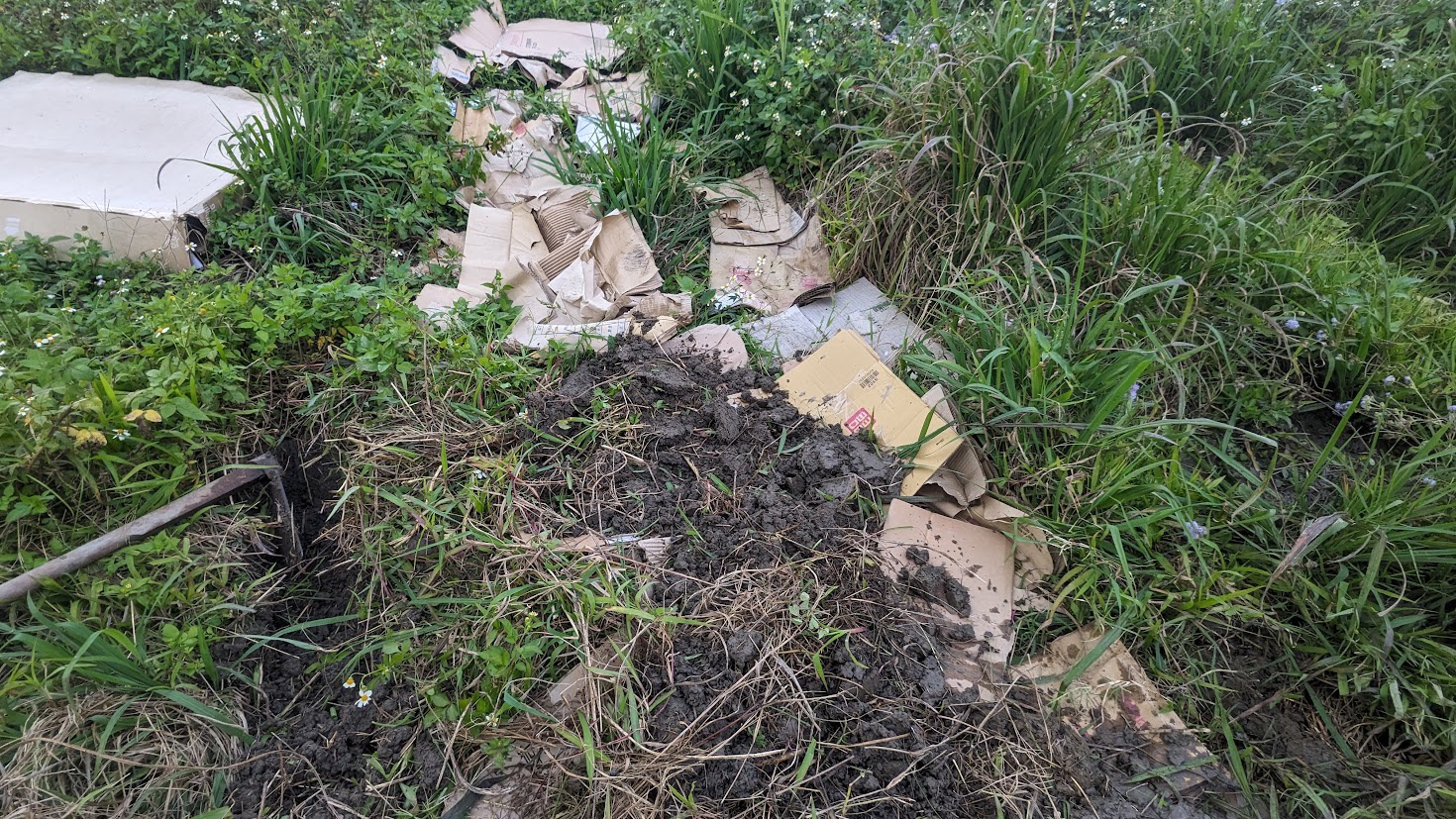 茂盛的咸豐草和其他禾本科雜草,連圓鍬都很難直接將土鏟起,必需用鋤頭先破土,然後才能使用圓鍬將土鏟起來,堆到紙板上。使用圓鍬或鋤頭是有方向性的,鋤頭的行進方式是往前進,圓鍬是邊退後邊剷土。