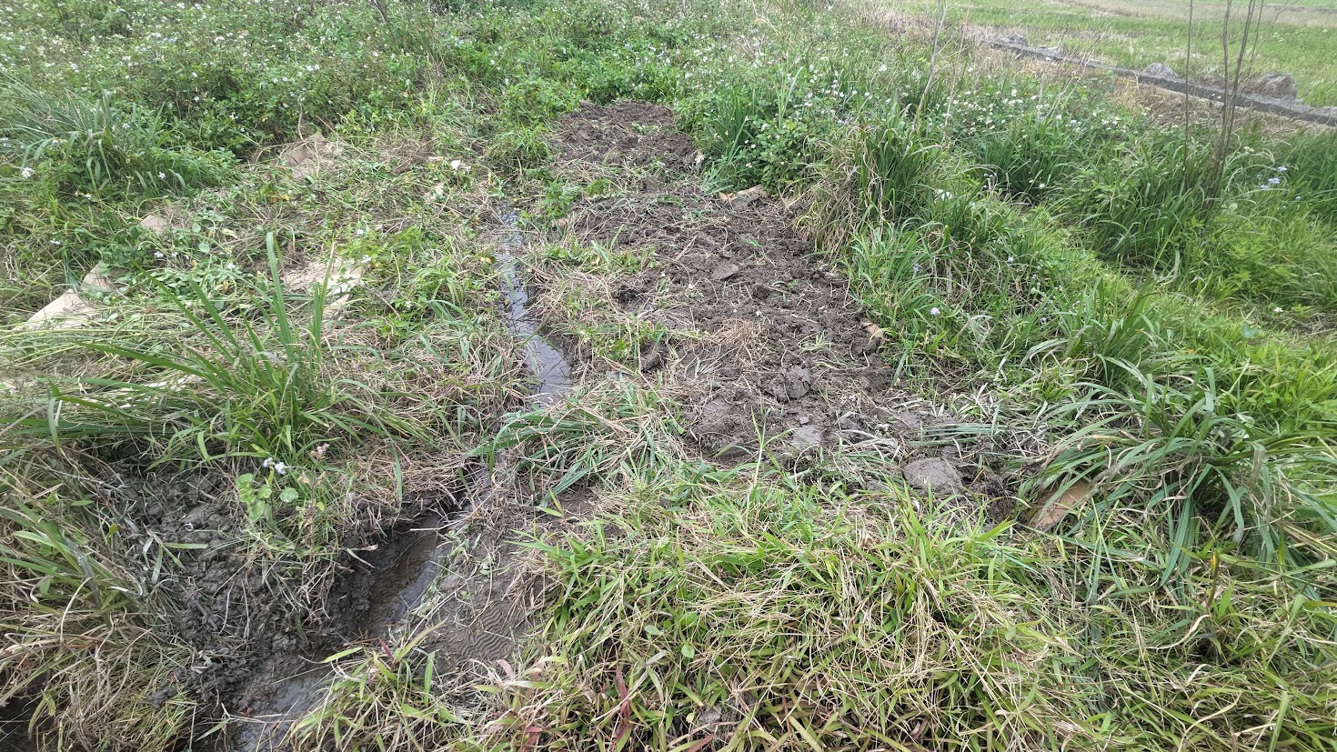 右邊是完成的菜畦,左邊是下一條菜畦,先鋪設紙板後,在上頭曬草。中間是灌溉水溝。