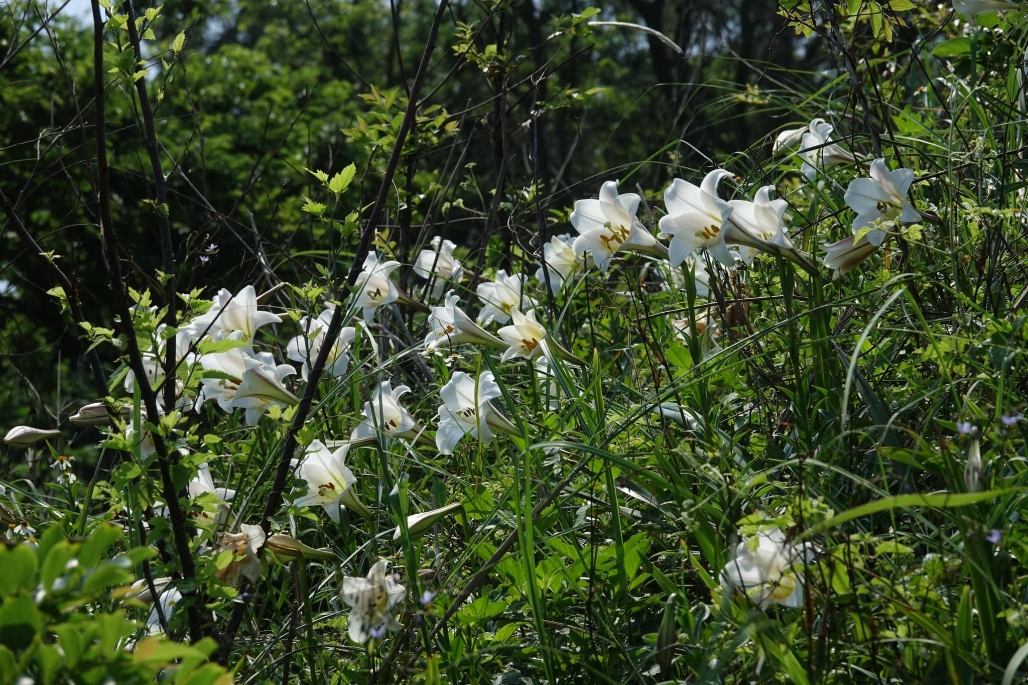 「看,那邊一整片⋯」艷陽下,我瞇著眼,遙看山丘上,荒煙漫草間,似一盞盞亮晃晃星辰的一朵朵白淨百合正努力盛放,但若不是駱明永引路,誰能看到這如來自仙境的花兒隱身荒野呢?我們跟著他,爬上陡坡,走進草長及大腿的野地,邊走邊撥開茂密的草,俟靠近時,感動如湧泉,如此野性又出塵的整片野生台灣百合已難尋覓,幸運如我!
