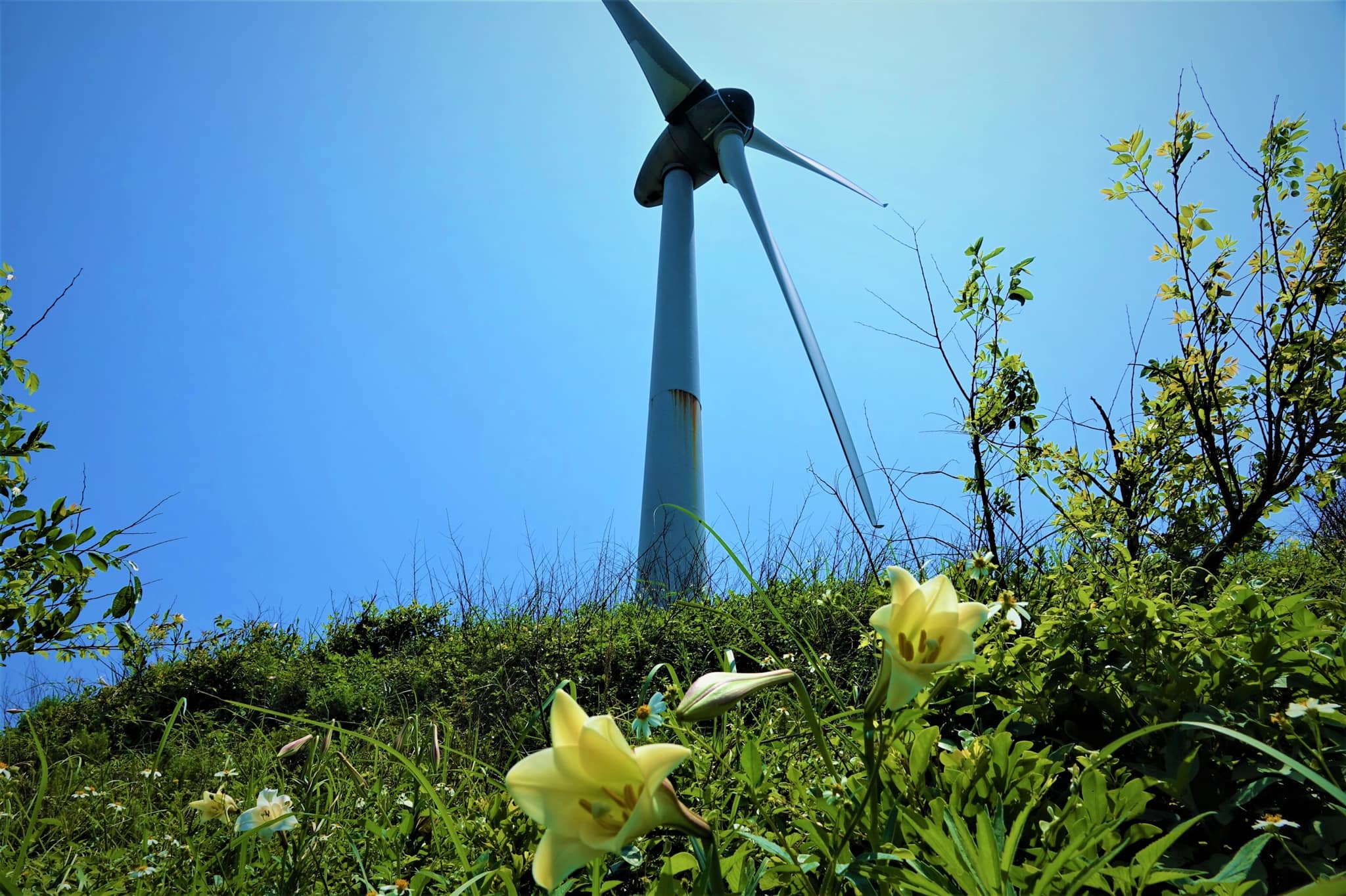 後龍海邊高聳著巨大的風力發電車,海岸邊坡,枝莖纖柔的台灣百合,堅強昂立,迎著海風和如大巨獸的風車對望著,形成一柔一剛,強烈對比,自然和能源的對峙,令人沉思⋯。