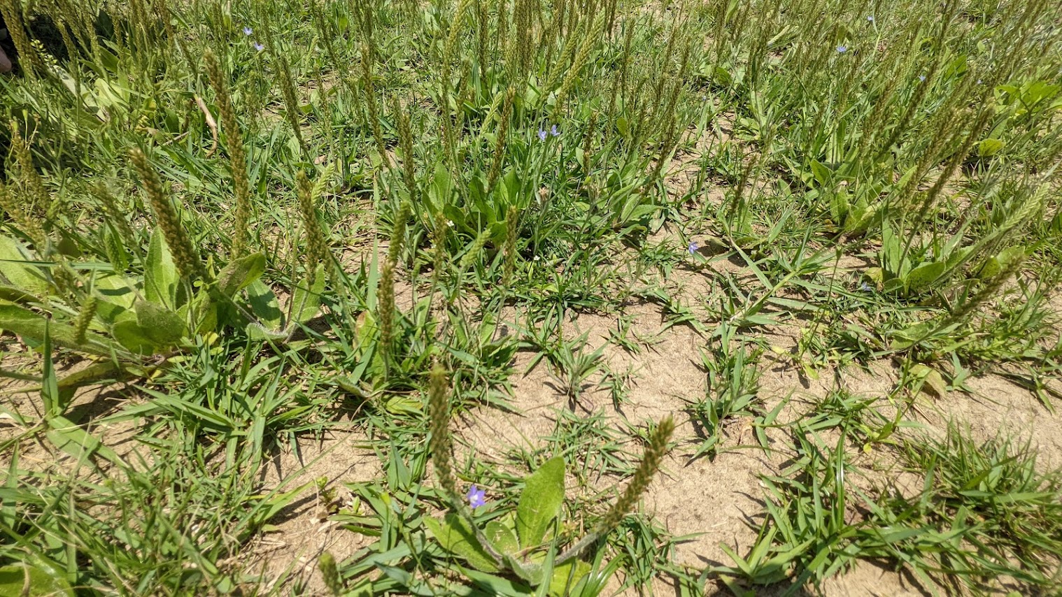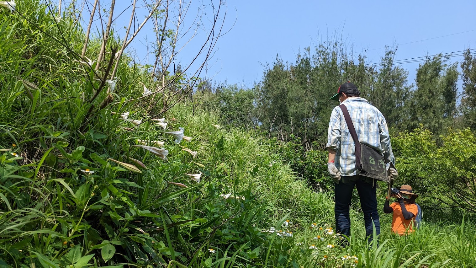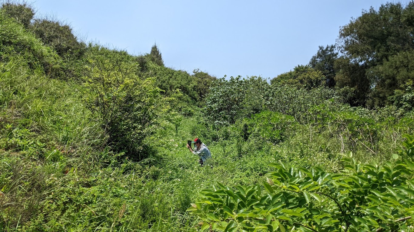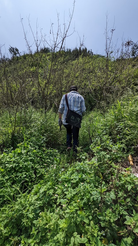 接著,駱明永就從他的摩托車置物箱裡,拿出一把鋸子和一把鐮刀,兩副手套,感覺接下來我們就要披荊斬棘的樣子,本人是帶隊者,只好勉為其難接下鐮刀。國香和茱力則回頭換上雨鞋。一行人跟著駱明永鑽進草叢,不過前行幾步撥開幾叢草後,太好了,根本不需要除草,前面早已有人踏出一條小徑了。