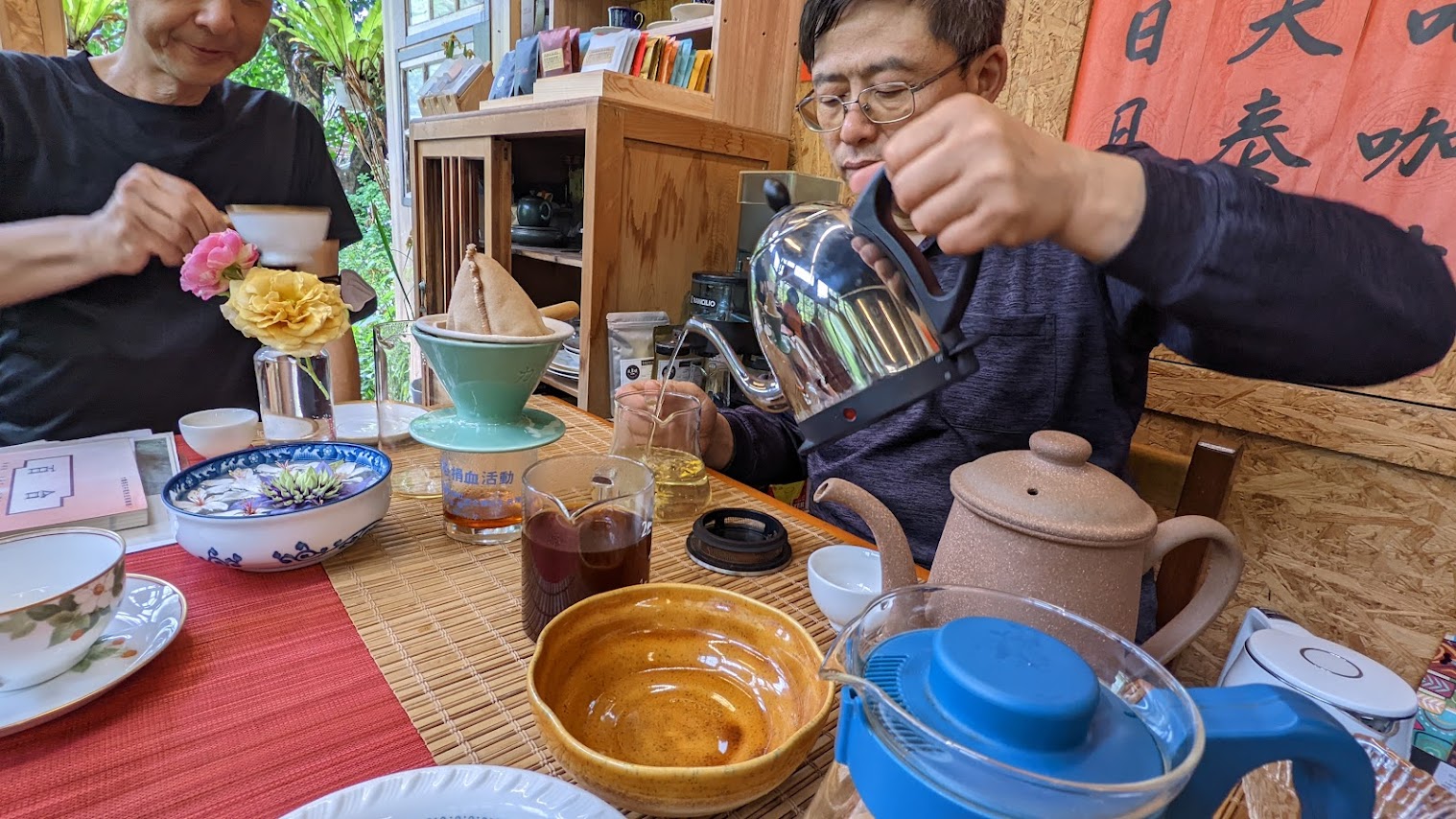 回到台灣百合工作室,繼續吃吃喝喝。由咖啡達人蔡明易沖泡咖啡和花茶,還喝了魚腥草加五葉松製作的酵素。