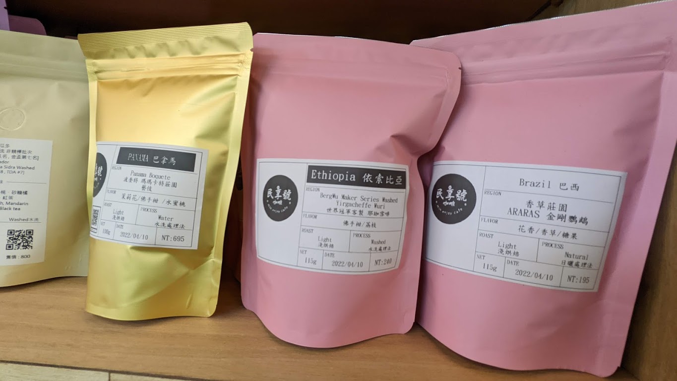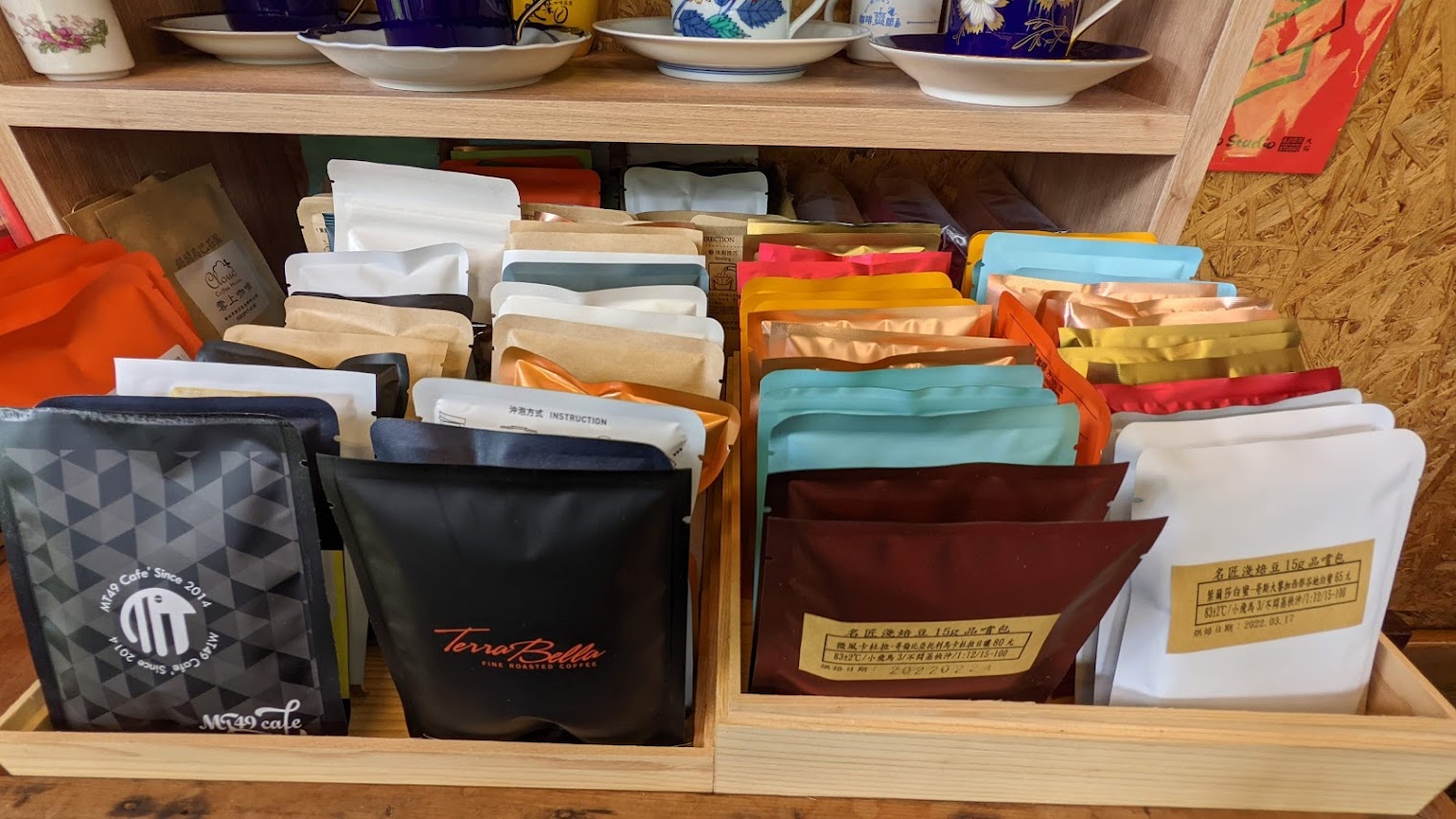 這裡可以喝到許多品牌的好咖啡。架上陳列各種不同風味的的咖啡。