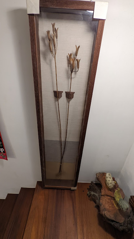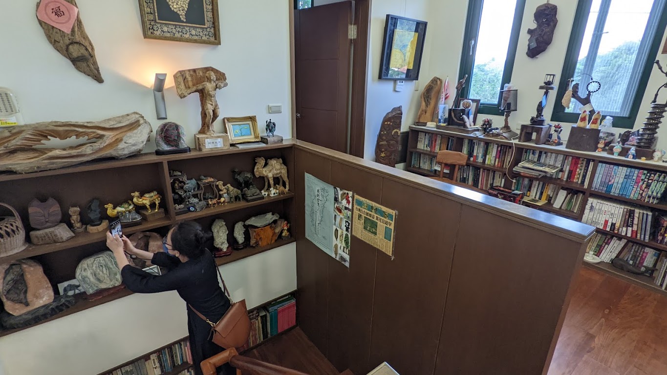 這裡收藏的不是百合就是台灣意象的藝術品,坐在古樸的木桌旁,聽著駱明永把家裡收藏的台灣精品一一介紹,他開玩笑說,可以來開一間賣台集團公司。