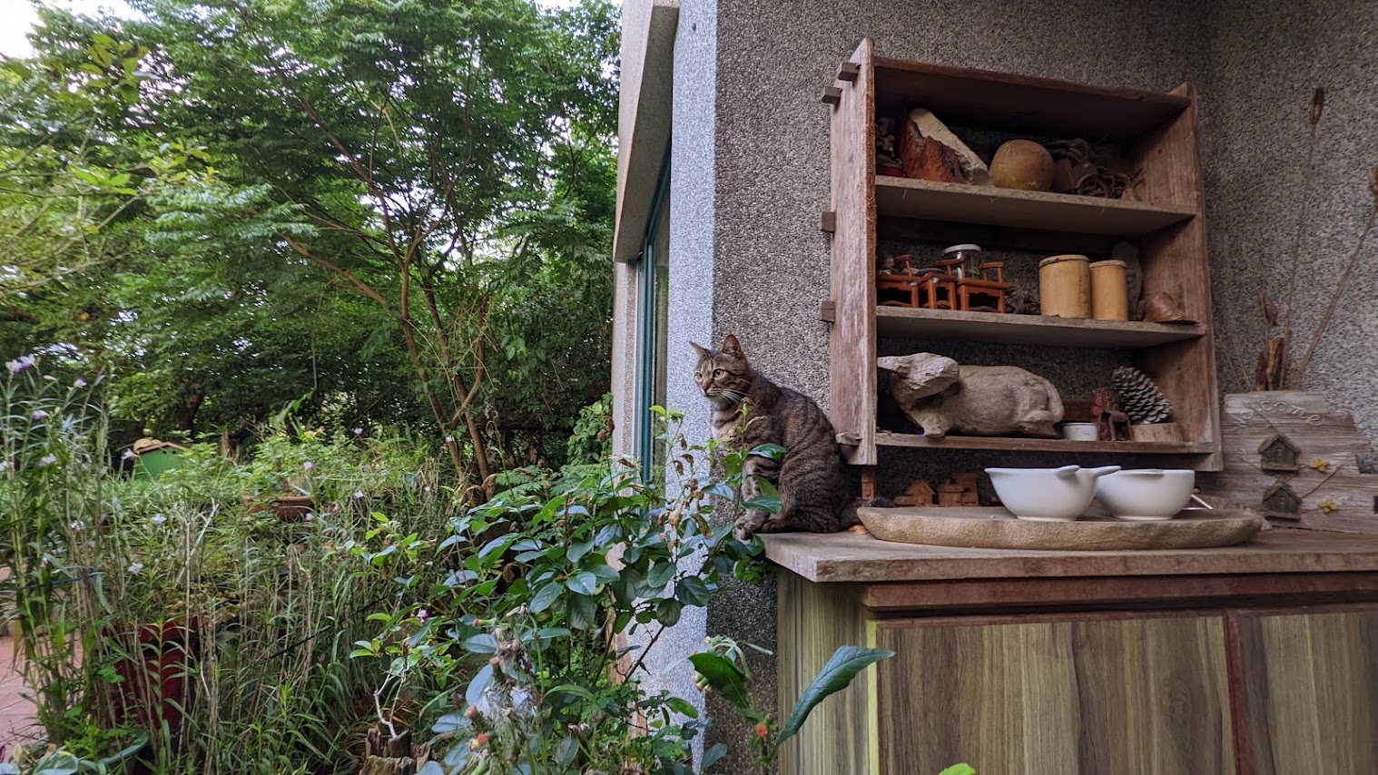 時間已經五點半了,已經超過表定解散時間兩小時。大家終於大包小包準備打道回府。門口這隻尾巴胖胖的麒麟尾貓似乎表示慢走不送!