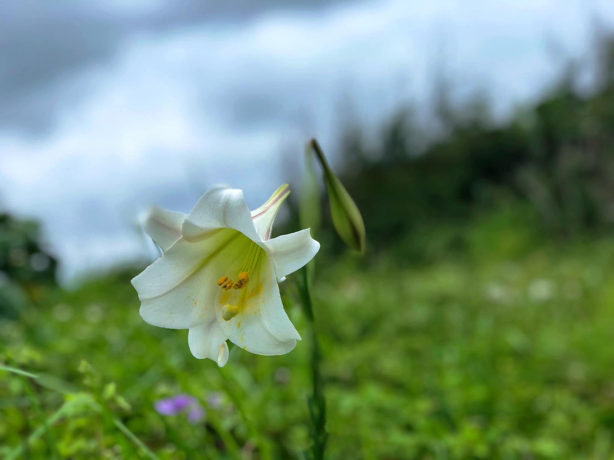 偶爾風停了,百合就立刻如整理好衣裝的愛美自愛的白衣少女,挺直了身軀,花容燦笑迎人,似乎剛剛沒有任何風雨經過般從容。看著她們,會聯想起台灣人代代篳路藍縷的開墾韌性。