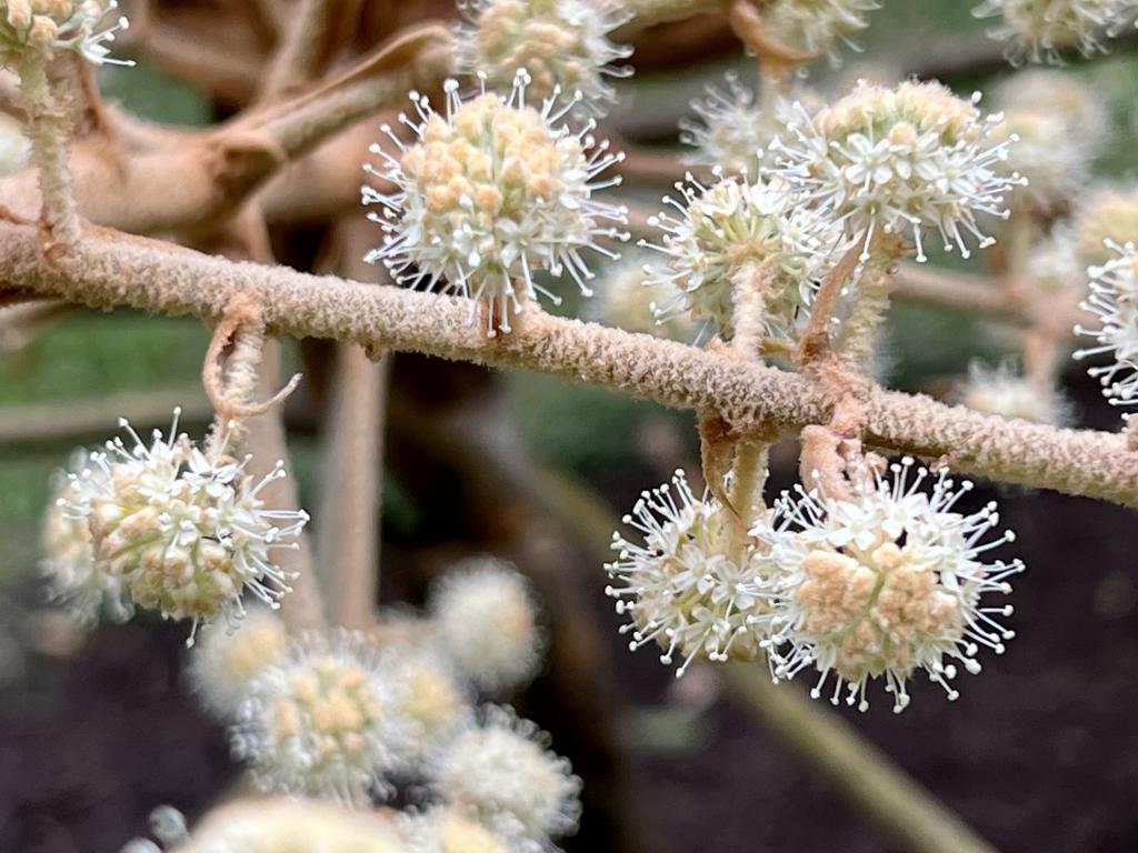 莖具白色髓心。葉常綠,紙質,直徑達 50 公分,7 ~ 12 掌裂,裂片卵狀長橢圓形,全緣至粗鋸齒緣;葉柄長達 50 公分,光滑。花序密被絨毛;花淡黃色,花萼密生柔毛,長約 1 公釐;花瓣長三角形,長約 2 公釐,外面有毛茸;雄蕊 4;花柱 2。