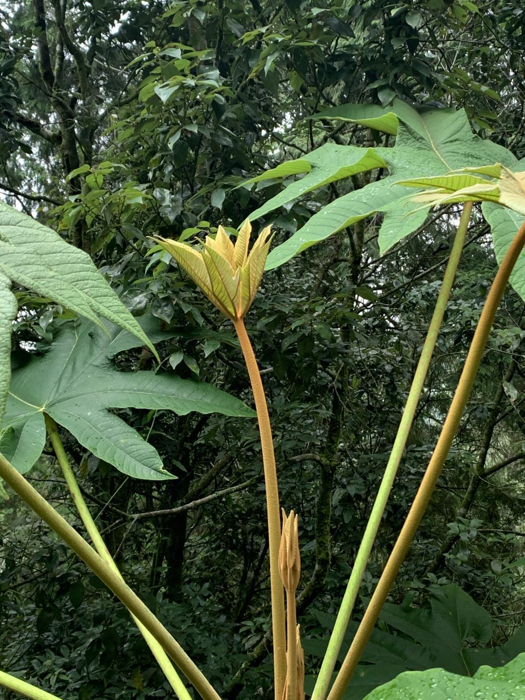 蓪草母株是兩年前採集自峨嵋小山屋自然農園,當時只有十幾公分高,不到三年已經長成如此這般,葉子大如傘,下雨簡直可以拿來遮雨。當初的母株長大後,不斷由地下走根繁殖新苗,我們將小苗採集,種到到盆子,歡迎喜歡的人來購買。