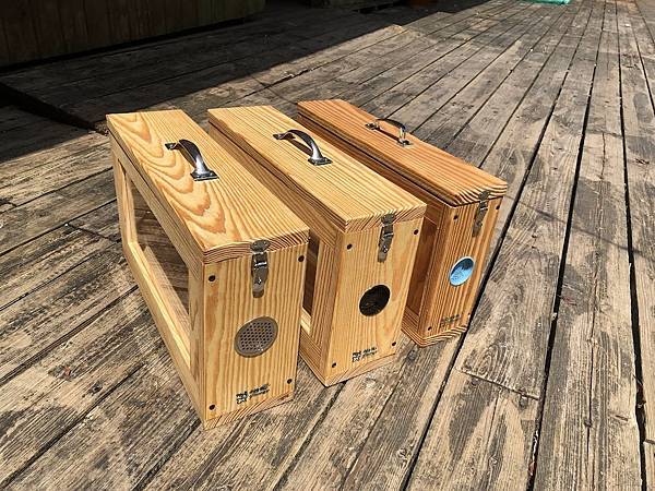 我們原來開發的是為了教學使用的單框透明蜂箱(照片最右側),因為只能放一框,不適合做為蜂王的交尾箱使用.所以我們又開發了兩框的透明觀察蜂箱,蜂王可以利用兩框之間保暖較果較好的區域活動。