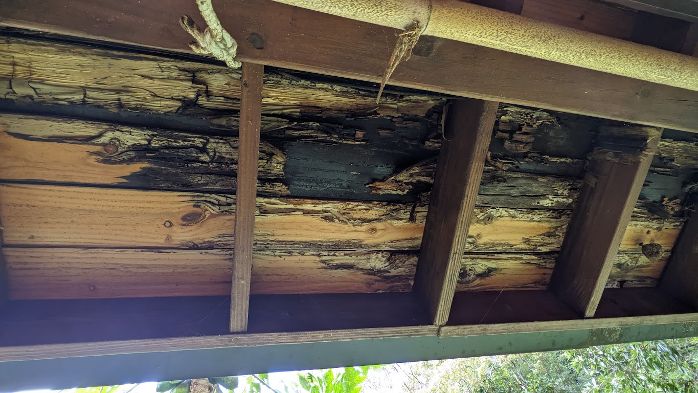 屋頂是木頭的橫樑支撐。因為 之前安裝太陽能板,直接貫穿鎖住 橫樑,導致有破孔 滲水。現在太陽能板已經拆除,也要處理屋頂漏水。