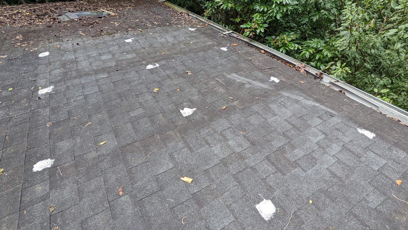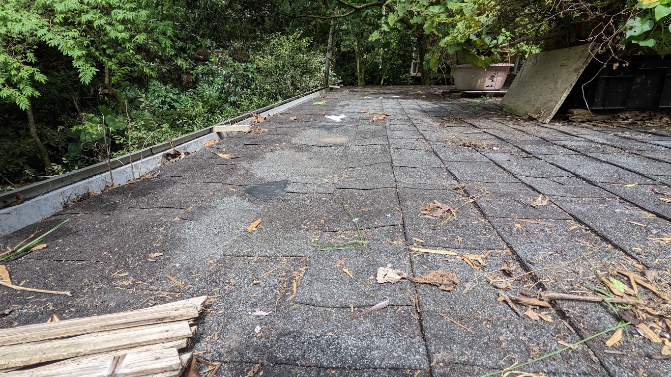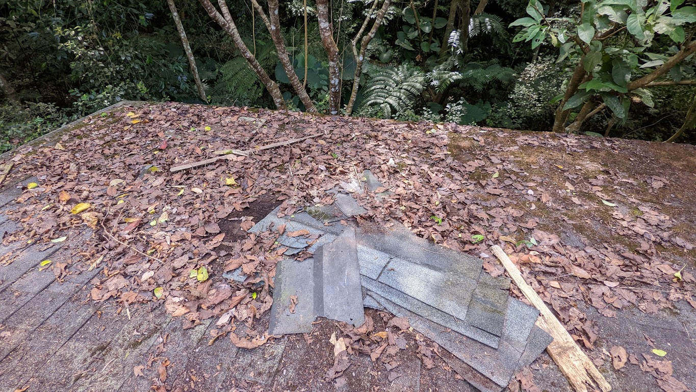 靠近邊沿的屋頂累積樹林的落葉,有覆蓋的可樂瓦,未受日曬的影響,應該壽命會比較長。